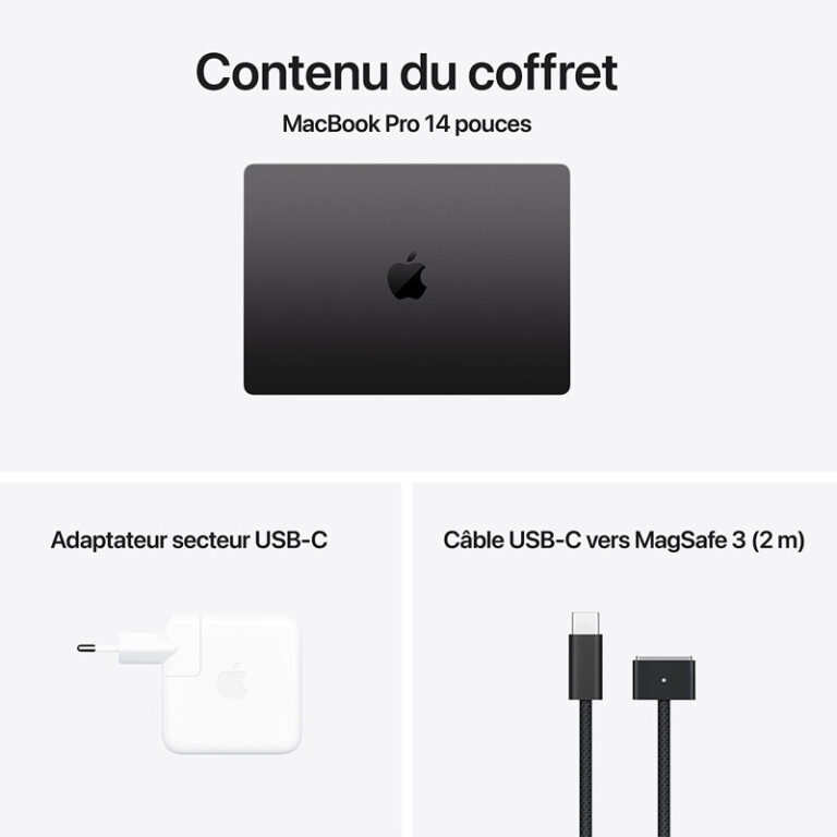 Ecran : Liquid Retina XDR 14″ (3024×1964 pixels) – Processeur : Apple M4 (10-Core/GPU10-Core) – Système d’exploitation : Apple macOS Sequoia – Mémoire RAM: 16Go – Disque Dur : 512Go SSD – Carte Graphique : Apple M4 GPU 10 coeurs – Wi-Fi 6E – Bluetooth 5.3 – Norme du clavier: Azerty – Lecteur biométrique – Connecteur disponible: 3X Thunderbolt 4/USB-C, 1x HDMI Femelle – Autonomie de la batterie: 24 Heures – Webcam – Microphone et haut-parleur intégré – Couleur : Noir – Garantie : 1 an