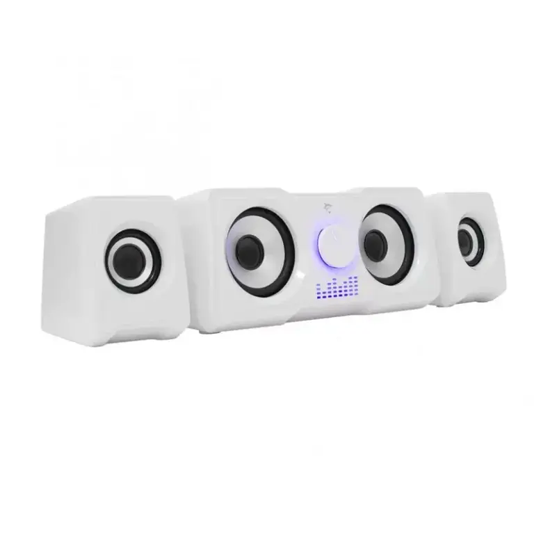 Technologie de Connectivité: Filaire – Interface: USB,Jack 3.5 mm – Puissance de sortie (mW): 2 x 5 Watts + 2 x 3 Watts – Type de haut-parleurs: 2.2 stéréo – Gamme de fréquences: 150 – 20000 Hz – Matériel: Plastique – Tension de fonctionnement: 5V – Rapport S/B: 85 dB – Illumination: effet arc-en-ciel (7 couleurs) – Longueur de câble: 1.3 mètre – Dimensions: 234 x 98 x 107 mm + 75 x 98 x 100 mm x 2 – Couleur: Blanc