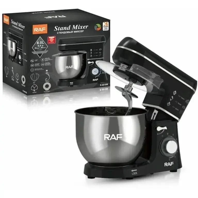 RAF R.6618B, Robot Pétrin puissant de 1400W avec une capacité généreuse de 8L, idéal pour tous vos besoins de pâtisserie. Son design élégant en noir s’intègre parfaitement dans toute cuisine moderne, tandis que ses multiples vitesses et accessoires vous permettent de pétrir, mélanger et fouetter avec une efficacité remarquable.