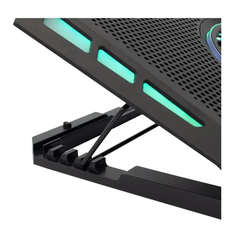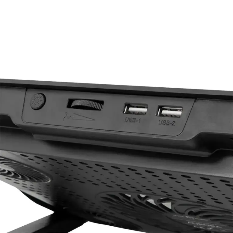 Interface: USB 2.0 – 5 ventilateurs – Vitesse du ventilateur: 1400-2500 tr/min – Dimensions ventilateur: 1x (140 x 140 x 20 mm) + 4x(70 x 70 x 15 mm) – Bruit: 5-15 dBA – Tension de fonctionnement (V): 5 – Matériau: Aluminium – plaque supérieure, Plastique – Débit d’air: 20-30 CFM – Réglage d’angle en 6 positions – Connecteurs: 2 x USB – Dimensions: 400 x 280 x 50 mm – Poids: 880 gr – Couleur: Noir